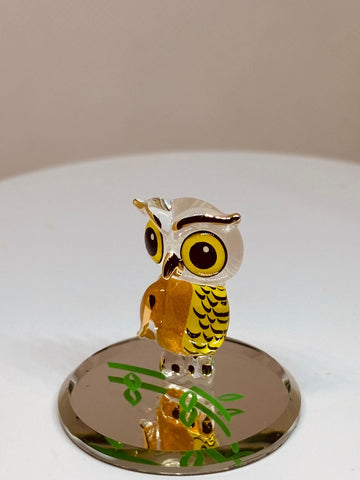 The owl has large yellow eyes with dark centers and a clear glass head. The body shows warm brown and yellow tones with feather pattern details on the front. It stands on a mirrored base with green leaf accents. The piece is accented with real 22Kt gold along select edges.