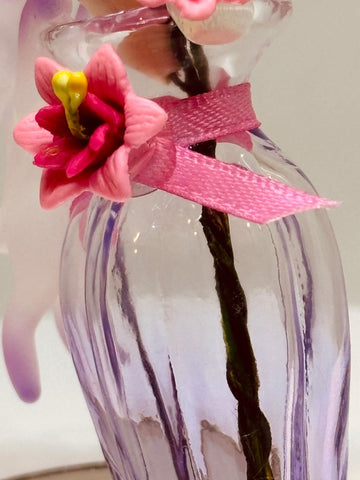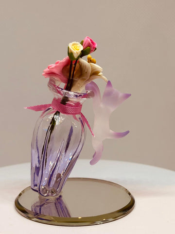 Cute Cat with Vase Figurine Handcrafted Pink Cat with Flowers on Glass