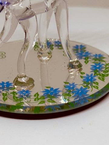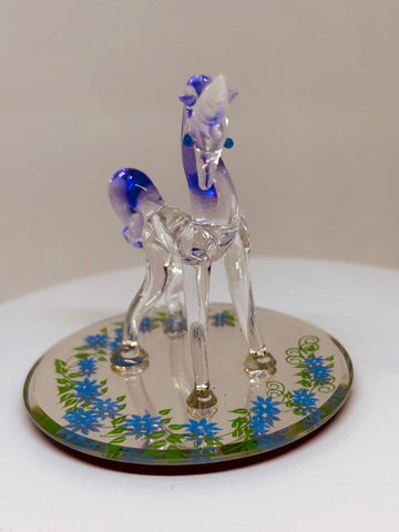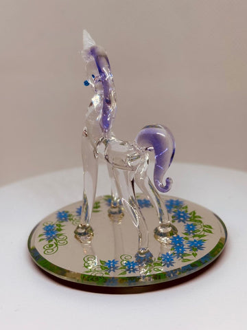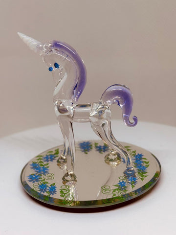 • Handcrafted glass unicorn placed on a beveled glass mirror