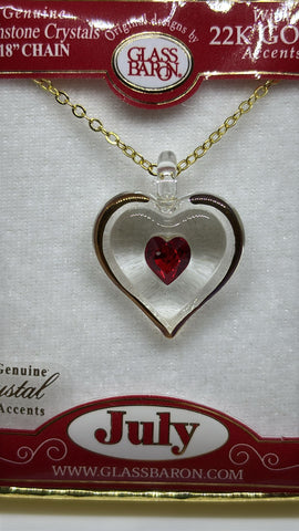 Celebrate a July birthday with the July Birthstone Heart Necklace. This handcrafted necklace features a heart-shaped pendant edged in real 22Kt gold and set with a red genuine crystal that represents the July birthstone.