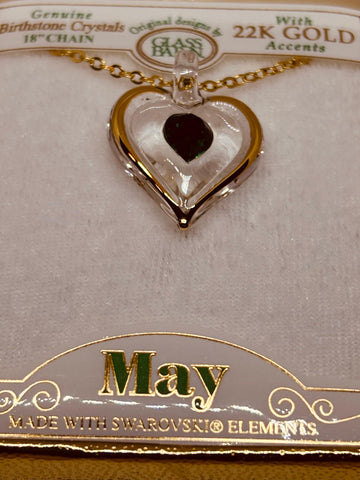 Celebrate a May birthday with the May Birthstone Heart Necklace. This handcrafted necklace features a heart-shaped pendant edged in real 22Kt gold and set with a green genuine crystal that represents the May birthstone.