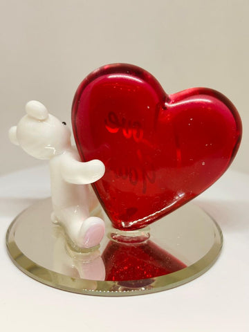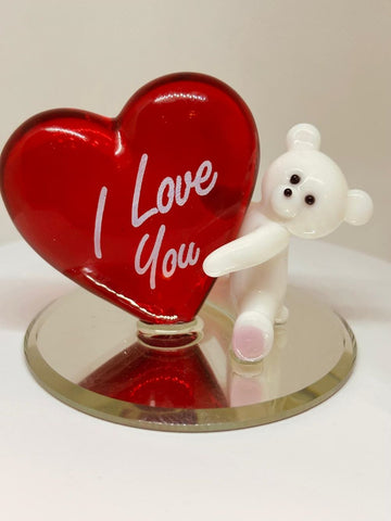 This handmade glass bear holds a bright red heart that says "I Love You," making it a perfect gift for someone special.