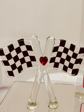 - Two handcrafted glass checkered flags crossed in a racing-inspired design