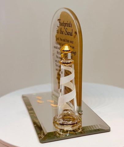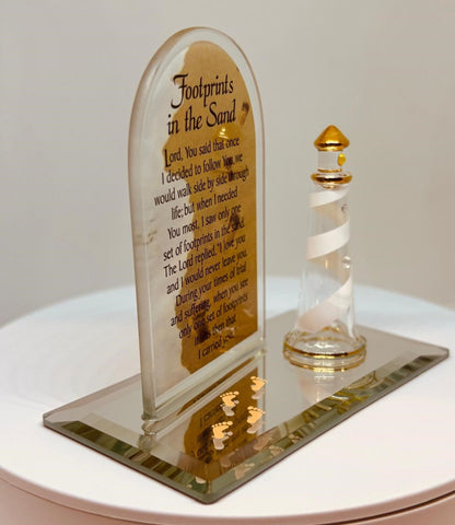 • Handcrafted plaque featuring Footprints in the Sand and a lighthouse