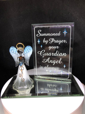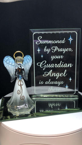 This handcrafted glass guardian angel figurine is a meaningful piece designed to inspire comfort and faith. Featuring a blue heart-shaped crystal, it carries the embossed words: "Summoned by Prayer, your Guardian Angel is always there."