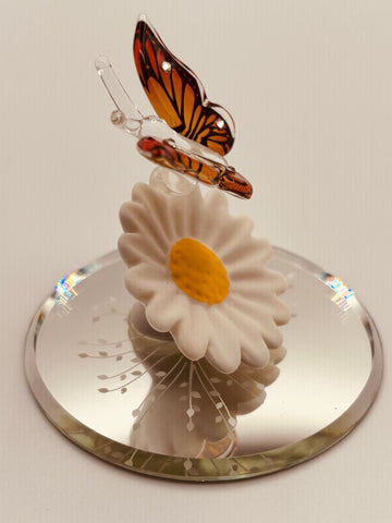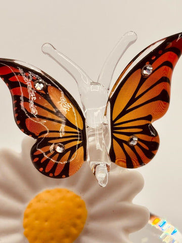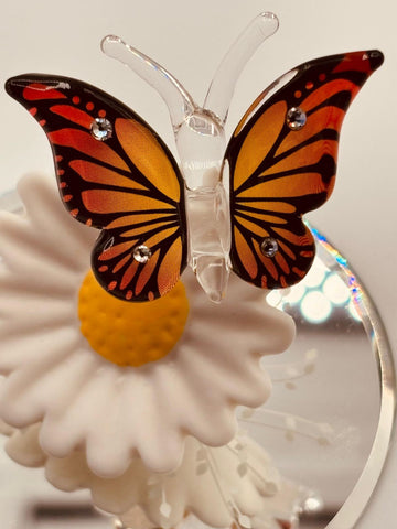 Butterfly on Daisy Glass Figurine | Handcrafted Nature Decor with Crystal Accents