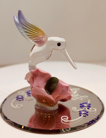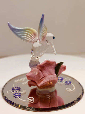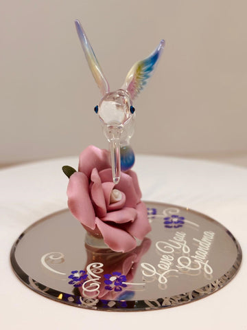 Celebrate the bond with Grandma through this handcrafted glass hummingbird design. Perched on a delicate pink rose and set on a beveled glass mirror, it's a heartfelt keepsake that carries a special message of love.