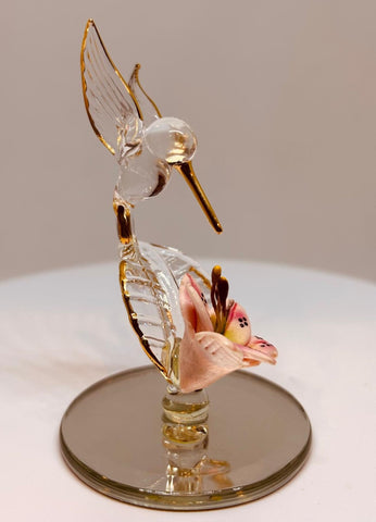 Hummingbird with Pink Flower Figurine Handcrafted Glass Nature Gift