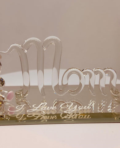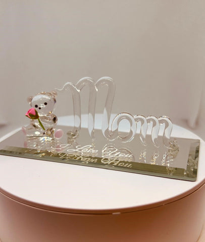 Celebrate the special bond with Mom through this handcrafted glass figurine. Featuring a sweet bear holding a flower beside a raised "Mom" sign, this piece is a heartfelt keepsake that shows love and appreciation. The etched "I Love You" message adds meaning, making it a thoughtful collectible for display at home or as a lasting reminder of affection.