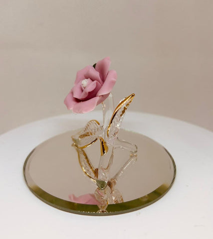 Show your love with this handcrafted glass rose figurine. The pink flower rests on a beveled mirror base and features real 22Kt gold accents. A perfect piece for romantic décor or a thoughtful gift for someone special.