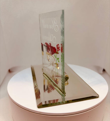 • Handcrafted figurine of a rose, placed on a hand beveled glass mirror with a decorative rectangle back plate
