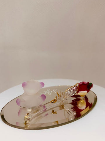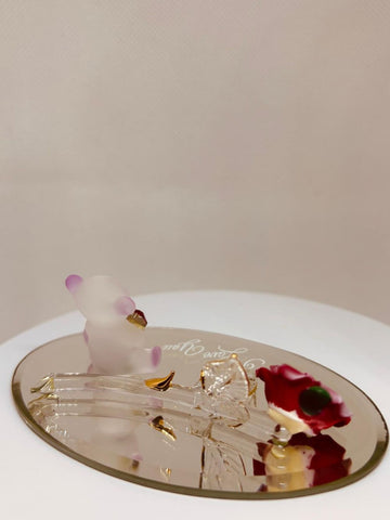 This Sweetheart Bear Figurine makes a thoughtful gift for someone special. Featuring a frosted glass bear holding a red heart beside a glass rose on a mirror base engraved with "I Love You," it's a perfect keepsake to express love and affection.