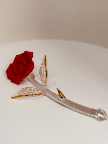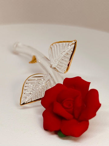 Red Rose Stem Figurine | Handcrafted Porcelain Rose with Glass Stem and 22Kt Gold