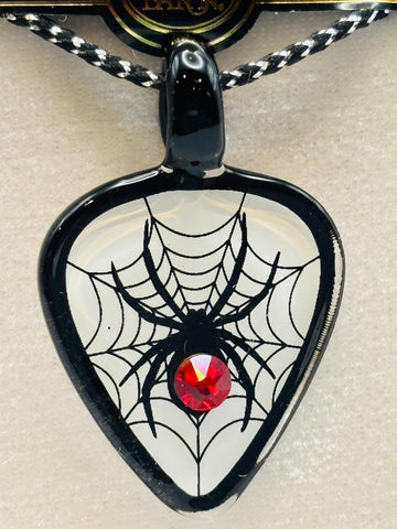 This handcrafted spider guitar pick necklace features a black spider web design with a red crystal accent at the center. The pendant is shaped like a guitar pick and hangs from an 18-inch black cord.