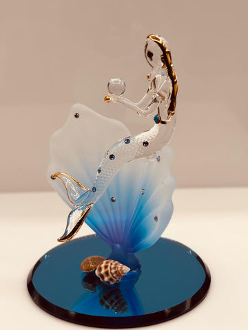 Mermaid on Blue Coral Glass Figurine | Crystal Ocean Mermaid Fantasy Décor