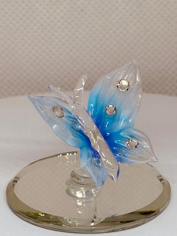 The Blue Butterfly Figurine is a handcrafted glass piece inspired by nature. This butterfly is displayed on a hand-beveled glass mirror and finished with crystal details and air-brushed color.