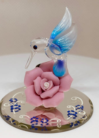 This Hummingbird with Pink Flower Figurine adds a gentle touch of nature to any space. The handcrafted glass hummingbird rests on a pink porcelain rose, detailed with crystal accents and soft airbrushed colors. A charming piece for collectors and nature lovers alike.