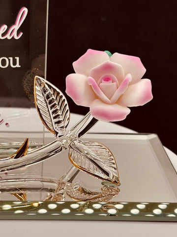 Let Mom know how much she means to you with this handcrafted “I’m Blessed” rose figurine. A pink porcelain open rose is displayed on a hand-beveled glass mirror base with a decorative back plate. Real 22Kt gold accents add detail to the design, while the back plate is embossed with the message: