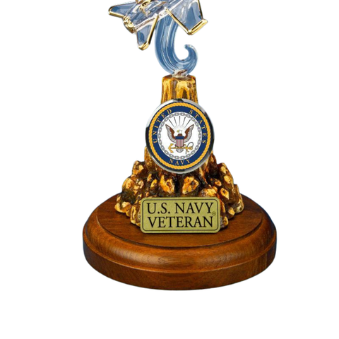 Honor your favorite U.S. Navy Sailor or Veteran with this handcrafted glass F-18 Fighter Jet. A bold tribute to those who serve, this piece features intricate glasswork, real 22kt gold accents, and a decorative base with a metal plaque that reads "U.S. Navy Veteran. "Perfect for Navy retirements, military graduations, or to proudly display your support for the armed forces.