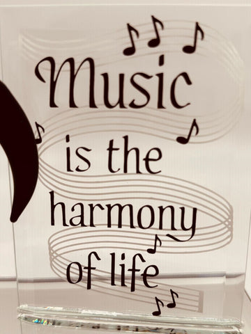 Embossed message: “Music is the harmony of life”