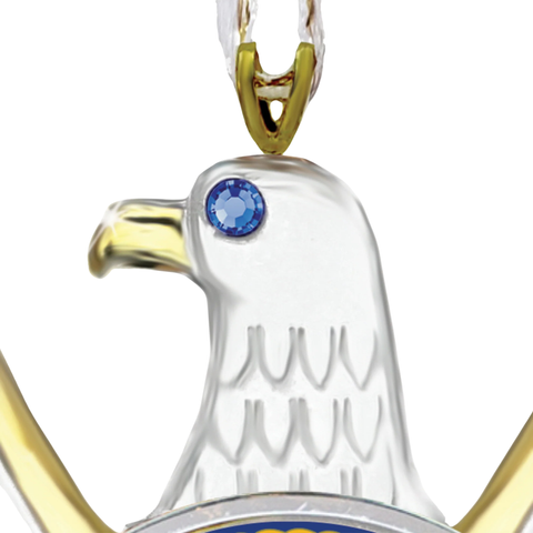 • Handcrafted glass eagle ornament with Navy emblem, hangs from gold ribbon