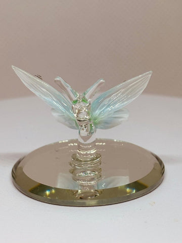 • Handcrafted figurine of a butterfly, placed on a hand-beveled glass mirror