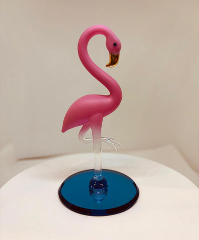 • Handcrafted glass flamingo sculpture on a beveled mirror base