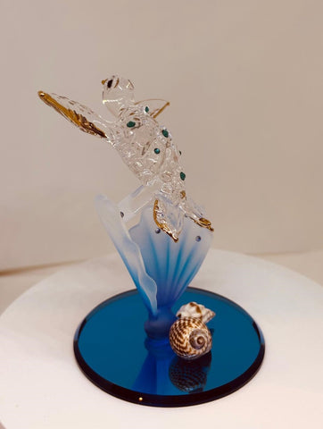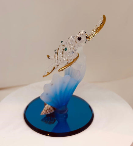 Sea Turtle on Blue Coral Handcrafted Glass Figurine with Crystals & Gold