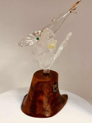 Add a touch of the ocean to your home with this handcrafted glass whale figurine. The clear glass whale is mounted on a solid walnut wood base and features gold accents. It's a lovely piece for anyone who enjoys sea life or coastal-style home décor.