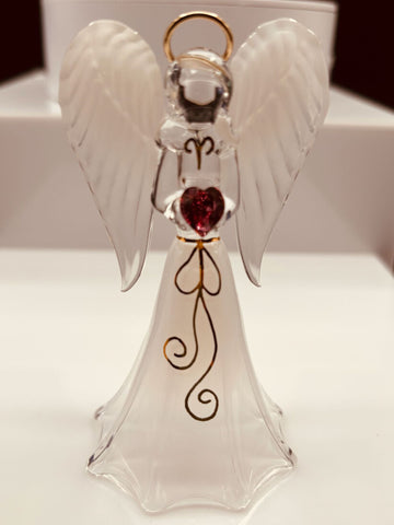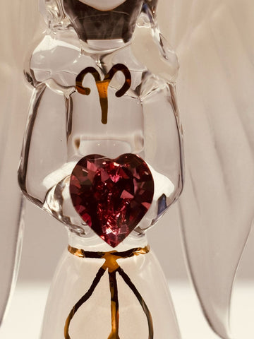 Share a message of faith and comfort with this handcrafted White Angelique (Large) figurine. The glass angel holds a heart-shaped rose-colored crystal and is finished with air-brushed details, genuine crystal accents, and real 22Kt gold highlights.
