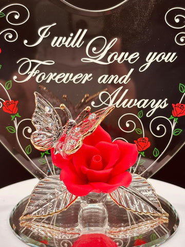 Celebrate lasting love with this handcrafted “I Love You Always” Butterfly and Red Rose figurine. A glass butterfly rests on a red rose, displayed on a hand-beveled glass mirror base with a decorative heart-shaped back plate. Genuine crystal accents and real 22Kt gold details enhance the design. The back plate is embossed with the message “I will Love you Forever and Always.”