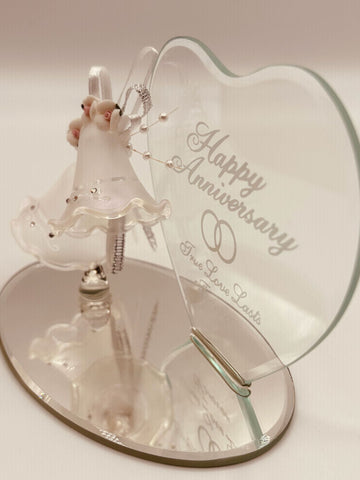 Celebrate your love story with this charming handcrafted glass Anniversary Bells figurine. A beautiful pair of bells with a heart-shaped backplate and loving message, it's the perfect gift to honor your lasting bond.