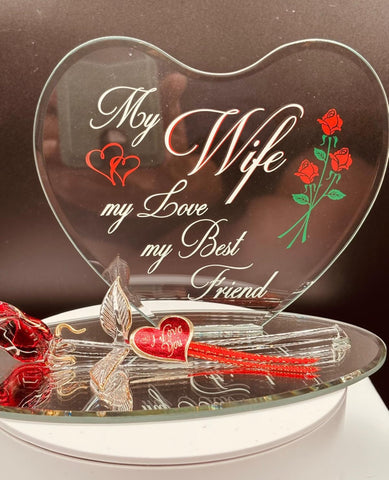 Let your wife know how much she means to you with the Rose “Wife, Best Friend” figurine. This handcrafted glass rose is displayed on a beveled mirror base and paired with a heart-shaped back plate.
