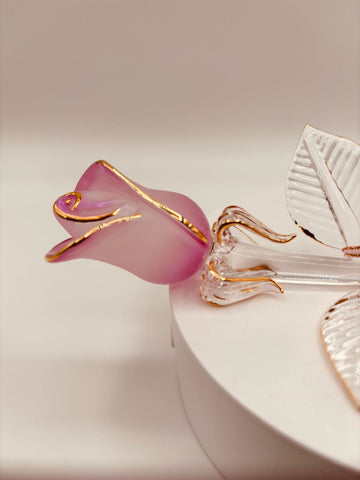 Show someone special how much they mean to you with the Pink Pearl Glass Rose Figurine. This handcrafted closed-stem pink rose is accented with real 22Kt gold and includes a heart-shaped tag that reads “I Love You,” tied with a pink and gold ribbon.