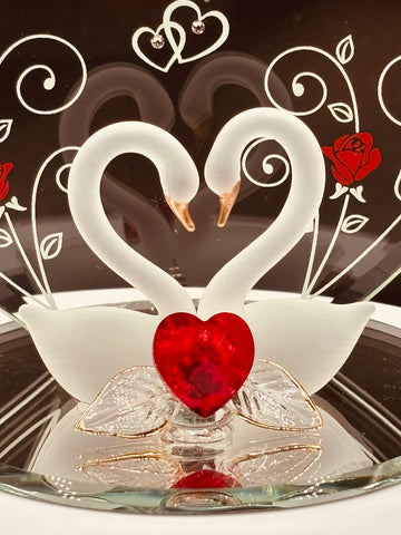 Celebrate love and commitment with the Together Forever & Always swan figurine. This handcrafted glass piece features a pair of swans joined by a red crystal heart, displayed on a hand-beveled glass mirror base with a decorative heart-shaped back plate.