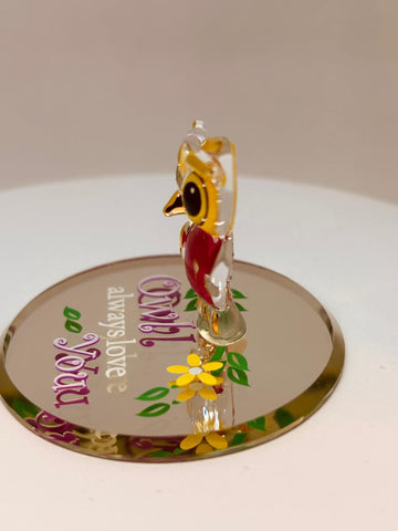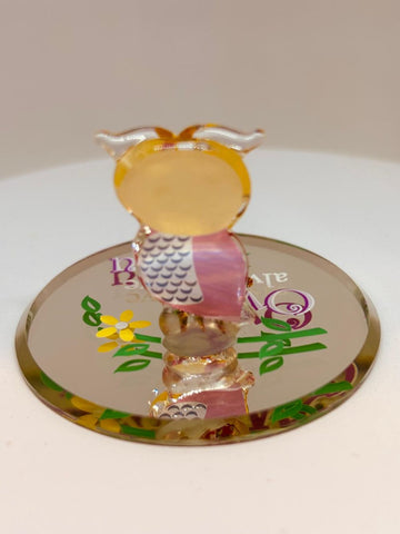 Handcrafted glass figurine of an owl on a beveled mirror base