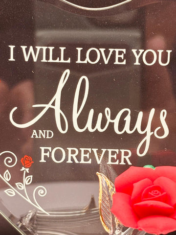 Remind someone special how much they mean to you with the handcrafted Always and Forever Rose figurine. This glass rose is displayed on a hand-beveled glass mirror base with a decorative heart-shaped back plate.