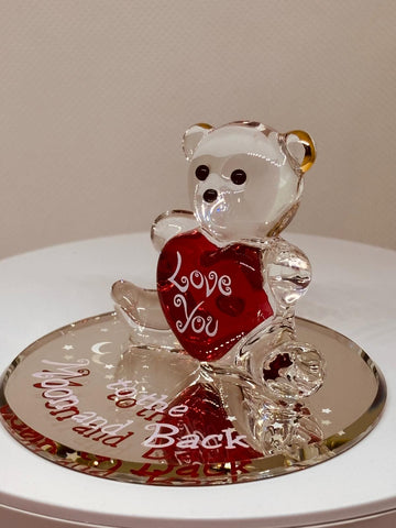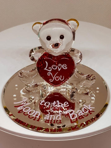 Celebrate a special relationship with this “To the Moon and Back” Bear Figurine. This handcrafted glass bear holds a red heart and sits on a hand-beveled mirror base, finished with real 22Kt gold accents. The message “Love you to the Moon and Back” makes this keepsake perfect for anniversaries, Valentine’s Day, or any moment you want to remind someone how much they mean to you.