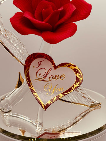 Express love and appreciation with this handcrafted “I Love You” Hummingbird on Red Rose figurine. A glass hummingbird rests on a red rose, displayed on a hand-beveled glass mirror base. Genuine crystal accents and real 22Kt gold details add depth to the design, while the attached message tag reads “I Love You.”
