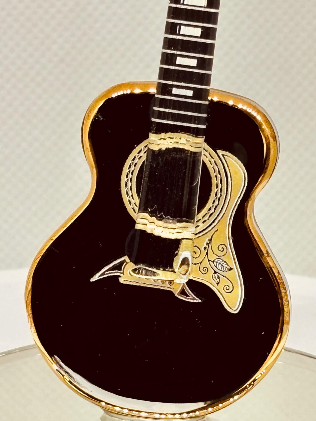 This Acoustic Black Guitar figurine is a handcrafted glass piece featuring a black acoustic guitar design. The figurine is accented with genuine crystals and real 22Kt gold to highlight the details.
