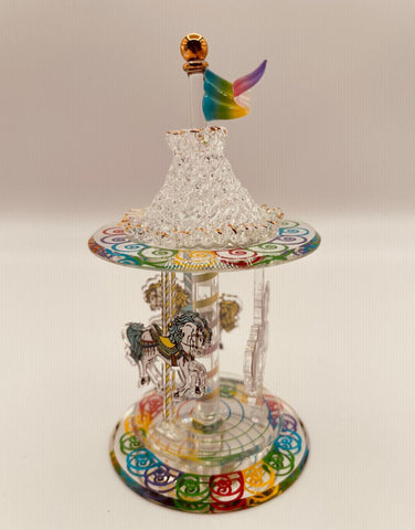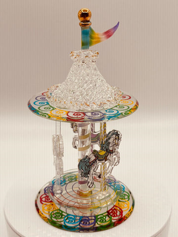 Bring childhood magic to life with this handcrafted Spinning Carousel Figurine. The horses rotate on a working carousel and the top features hand-stitched glass with 22Kt gold accents and airbrushing.