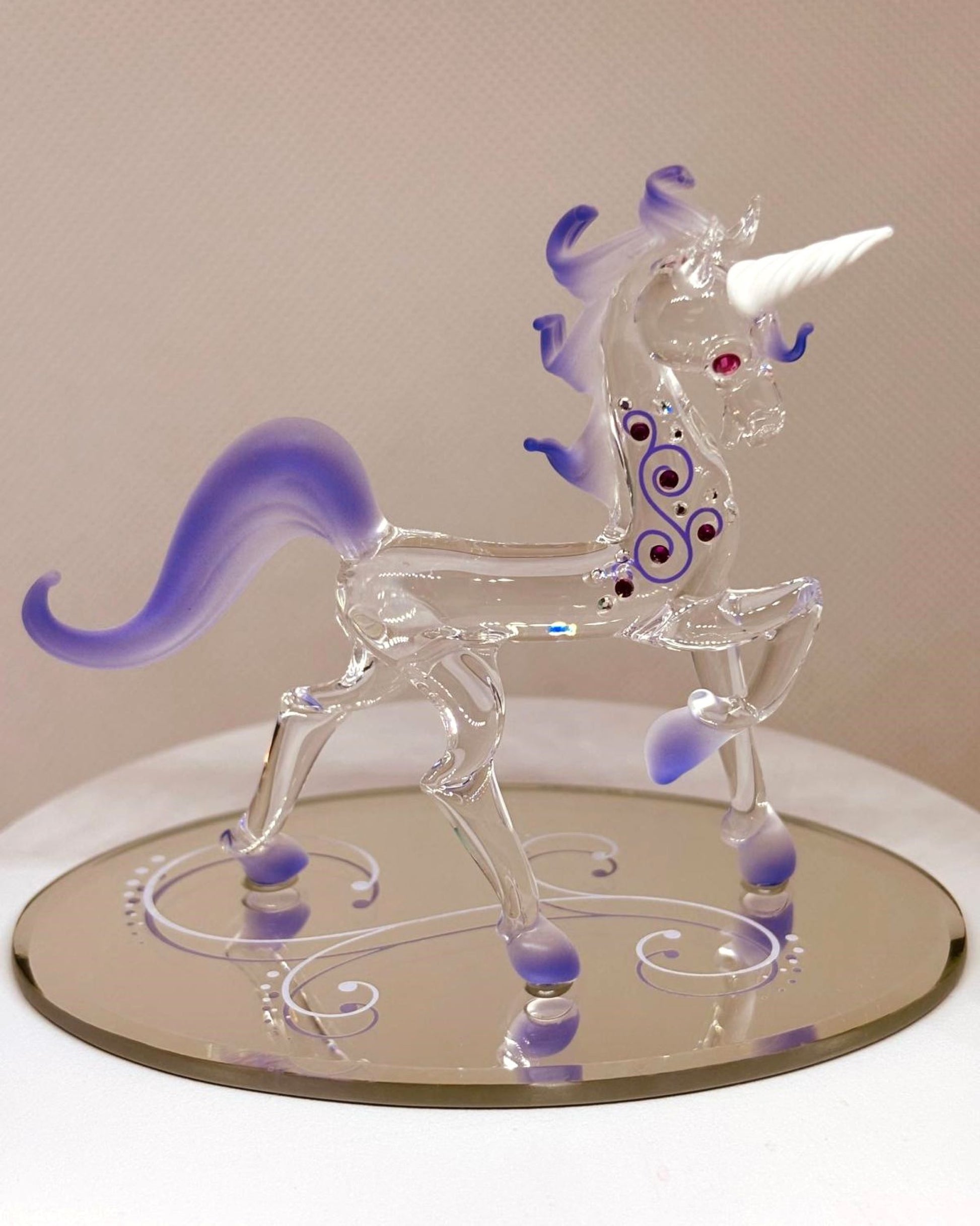 Bring a touch of fantasy to your space with this handcrafted Fairy Tale Unicorn glass figurine. The design features a clear glass unicorn with a purple mane and tail, displayed on a beveled blue glass mirror base.