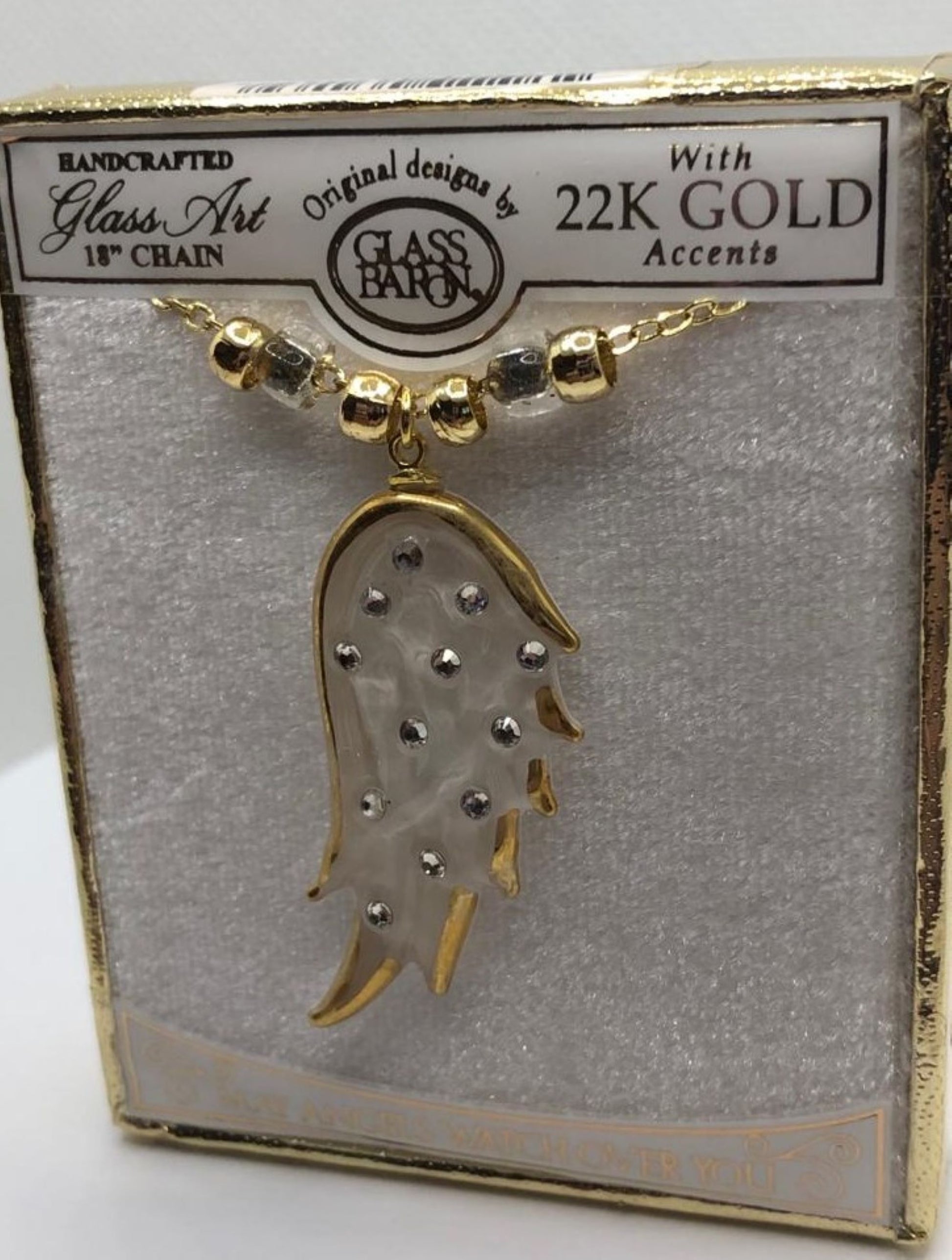 Hangs from an 18" gold-plated beaded chain