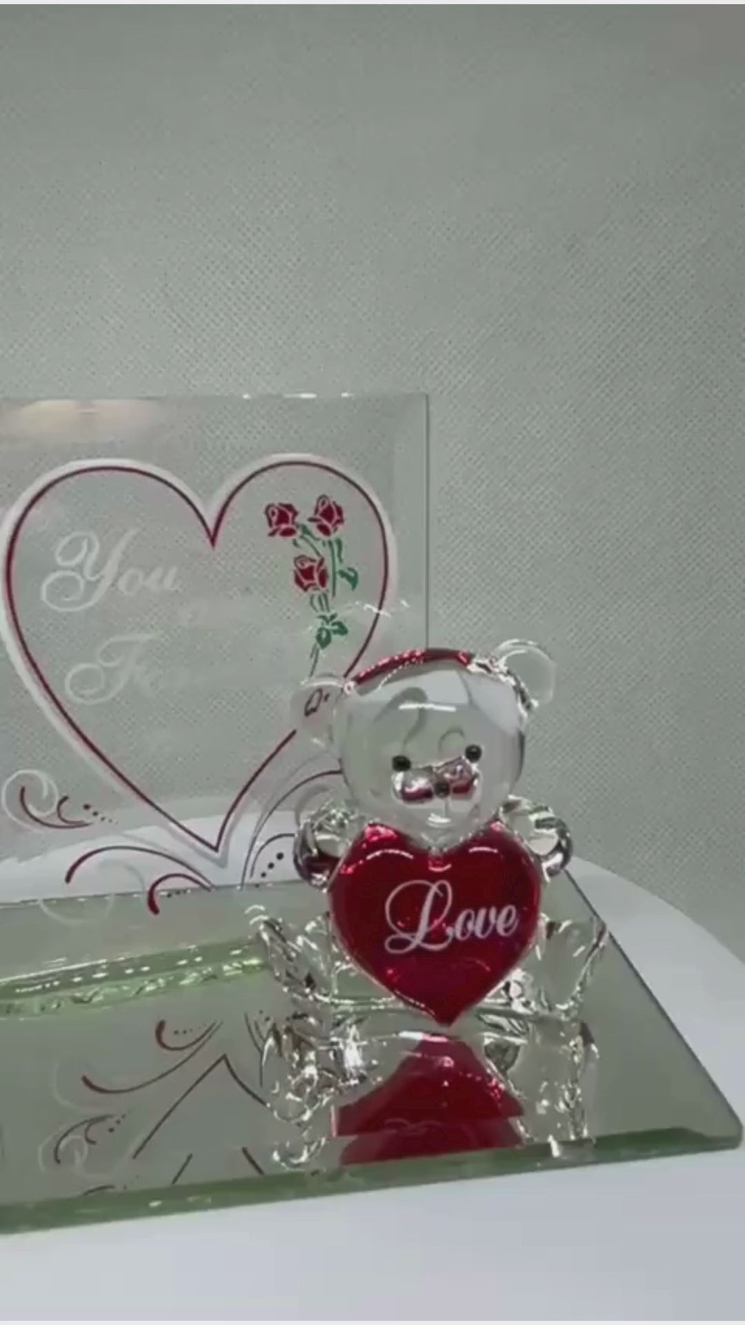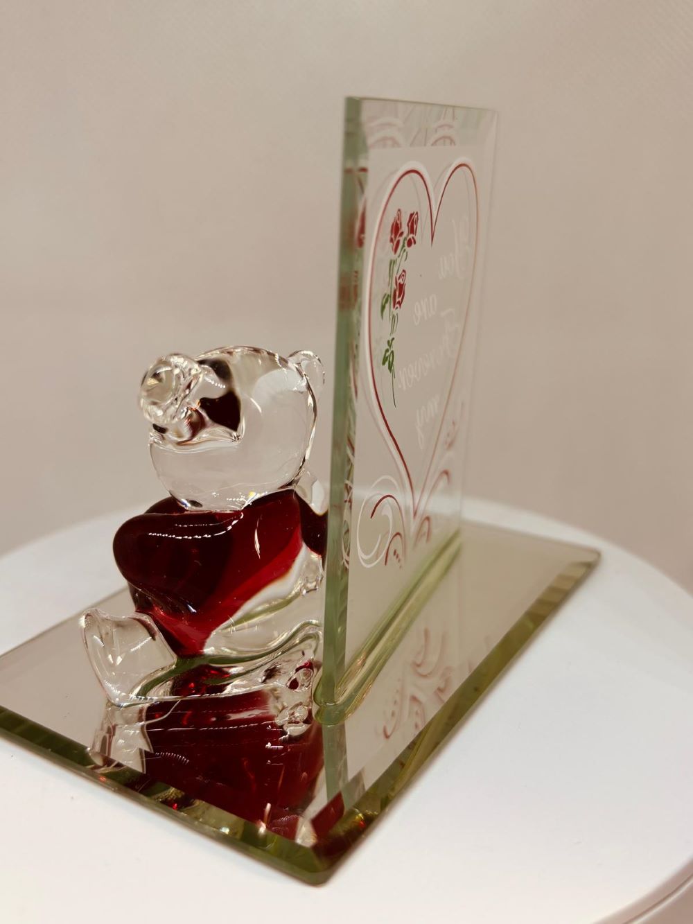 • Handcrafted glass teddy bear figurine holding a red "Love" heart