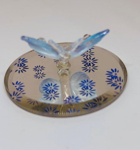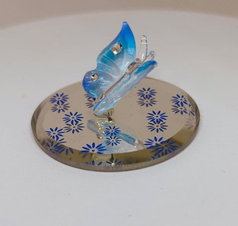 Bring a touch of nature into your home with this beautiful glass butterfly figurine. It has clear and blue wings with small crystal accents and sits on a round mirror base with blue flower designs. Perfect for home display, gifts, or collections.