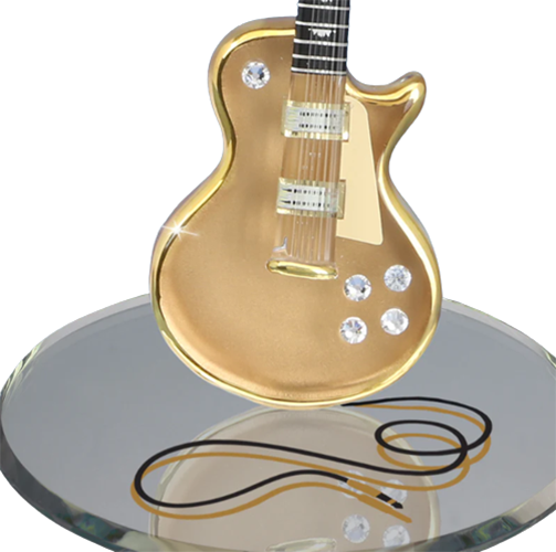 Add music-inspired style to your décor with this handcrafted Classic Gold Top Guitar figurine. The guitar sits on a beveled glass mirror designed with a guitar cord pattern, making it a nice accent for display shelves, desks, curio cabinets, or gift collections.