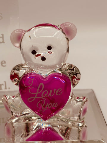• Handcrafted glass teddy bear holding a pink heart with “I Love You”