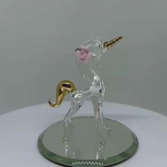 Add a touch of magic to your home with this handcrafted glass unicorn figurine. Made from clear glass with gold details, this charming piece is perfect for collectors or anyone who loves fantasy décor.