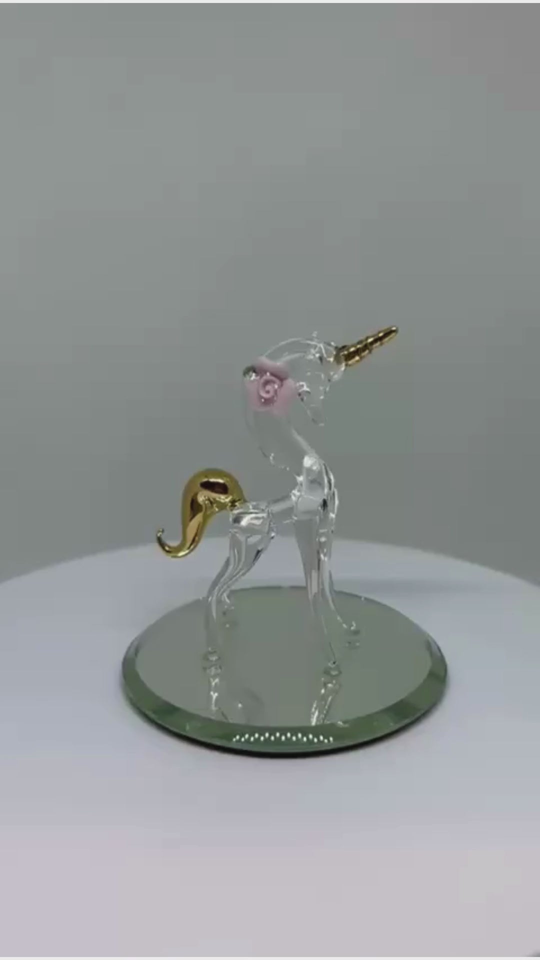 • Handcrafted glass unicorn figurine on a beveled glass mirror