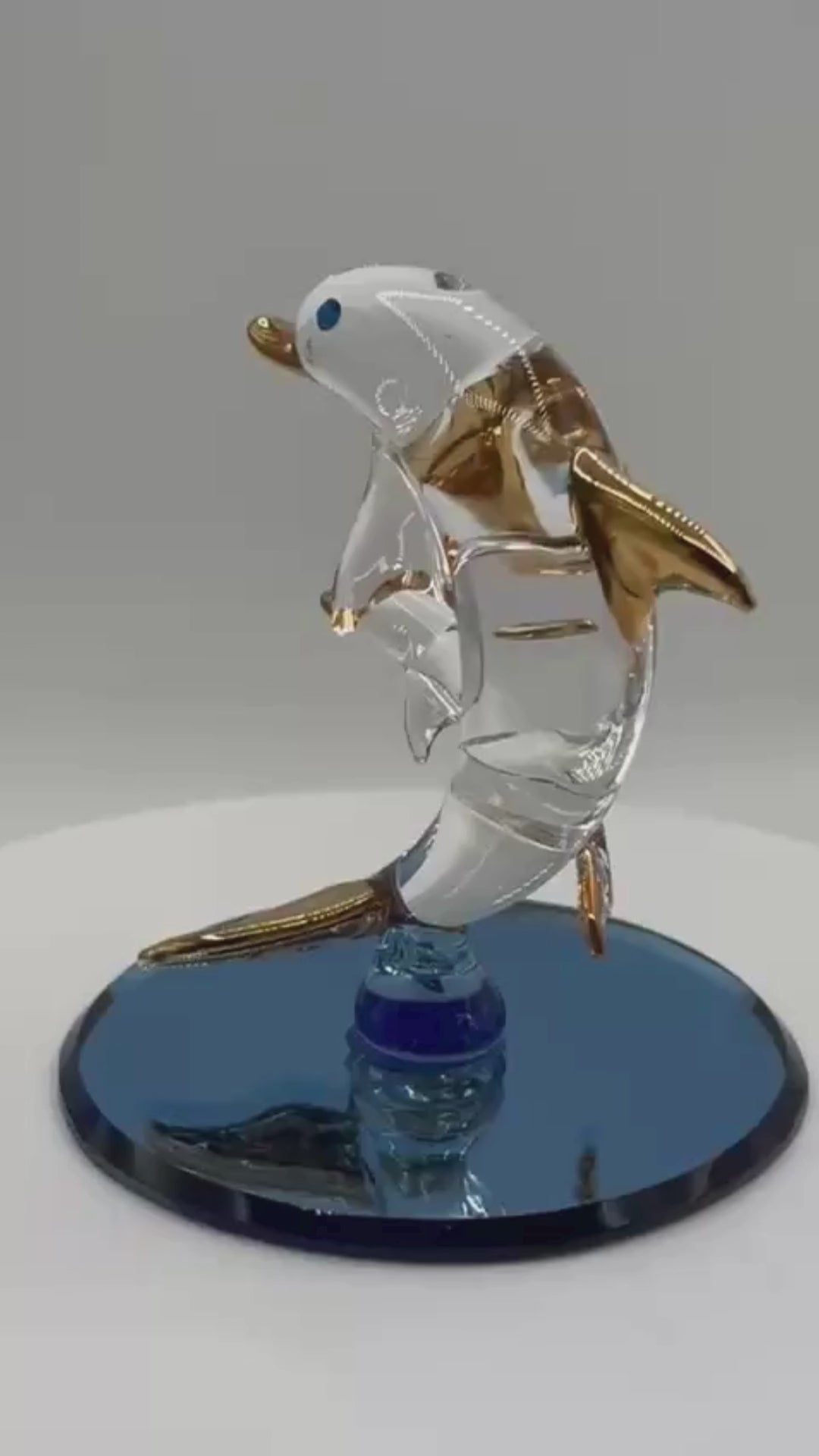 Enjoy ocean-themed décor with this handcrafted Dolphin and Baby glass figurine. The dolphins are displayed on a hand-beveled blue mirror base, making this piece a nice accent for shelves, desks, curio cabinets, or themed displays.